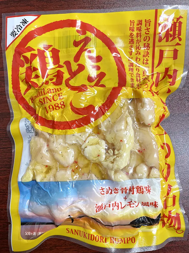 | 原材料名 | 鶏肉(国産)、食塩(香川県産)、胡椒、にんにくパウダー(にんにく:香川県産)、たまねぎパウダー(玉ねぎ:香川県産)、とうがらし(香川県産)、醤油(大豆、小麦含む)、調味料、(アミノ酸等) |
